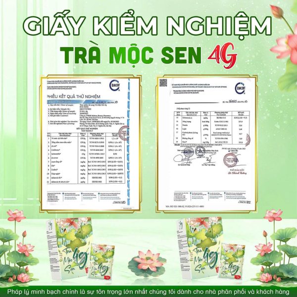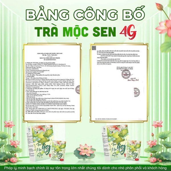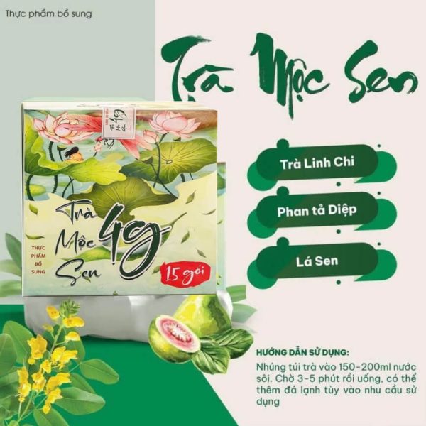 Thành phần của Trà Mộc Sen 4G bao gồm: Trà linh chi, Phan tả điệp, Lá sen, Trà xanh, Cảm thảo, Búp ổi, Cỏ ngọt,…