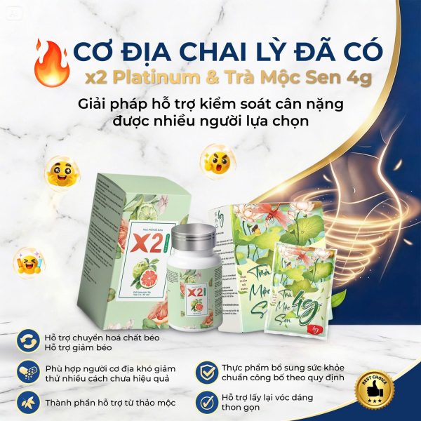 - Giải pháp đến từ thiên nhiên – Viên Detox X2 Platinum kết hợp với Trà Mộc Sen 4G – Giúp bạn thanh lọc cơ thể, detox nhẹ nhàng, cơ thể cân bằng và lấy lại năng lượng tươi mới mỗi ngày.
