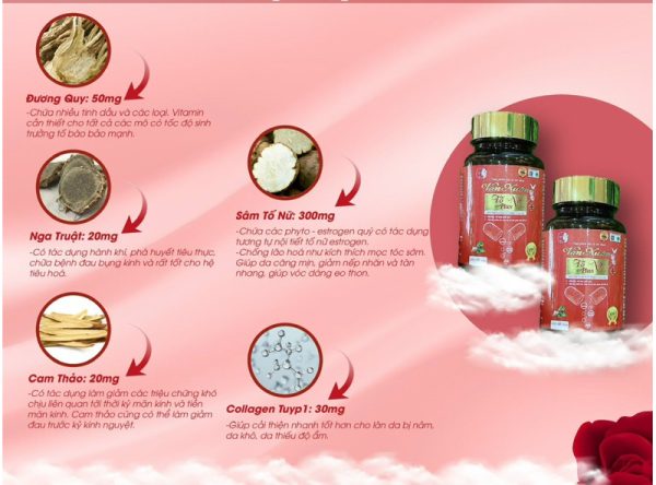 - Sản phẩm hỗ trợ cân bằng ổn định nội tiết tố nữ, giảm các triệu chứng mất ngủ, bốc hỏa, yếu sinh lý, da khô sạm…. mang đến cho chị em phụ nữ một diện mạo mới hơn trong cuộc sống.